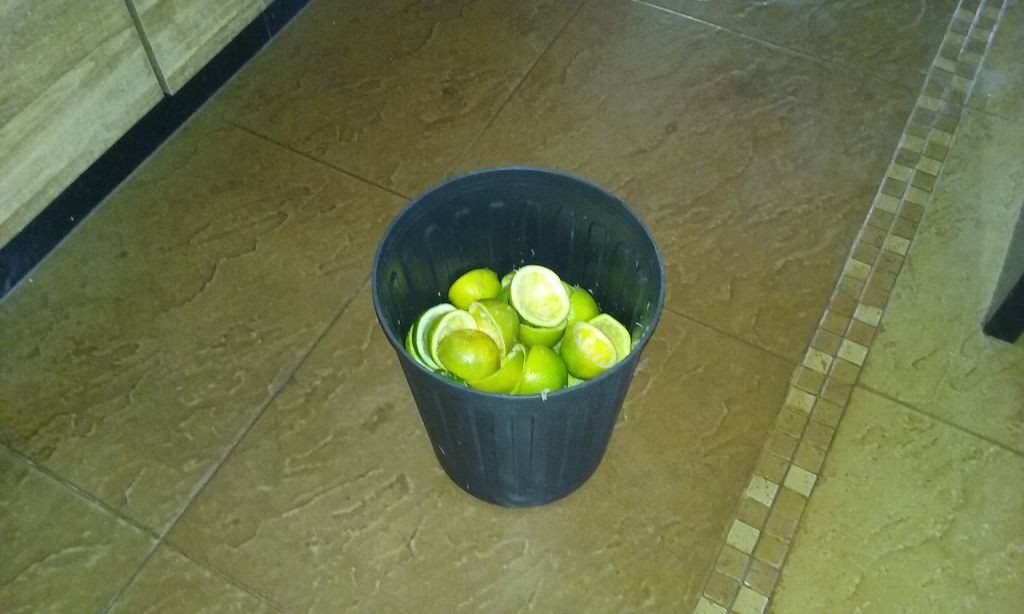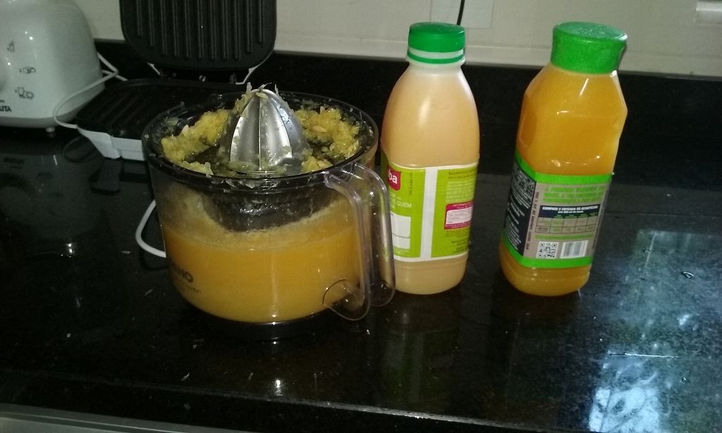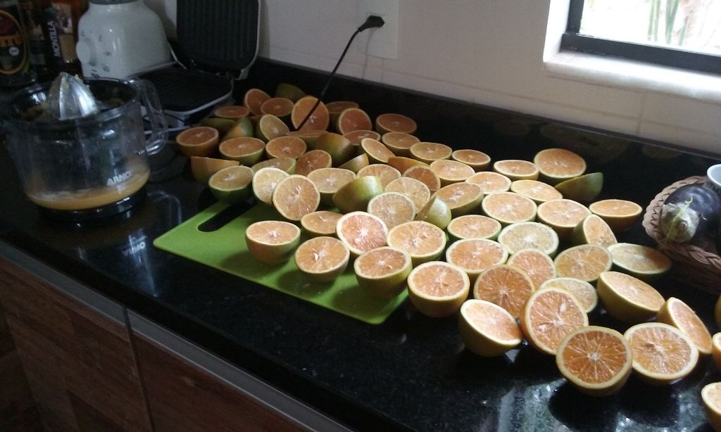 Vom Rohstoff zum Endprodukt in 30 Minuten. 45 Orangen ergeben 3 Liter Orangensaft und einen Eimer voll Schalen. 24 Orangen kosten umgerechnet 1,30 Euro. Macht 0,90 Euro pro Liter echten Orangensaft. Im Laden kostet frisch gepresster Orangensaft hier umgerechnet 2,20 Euro. Da lohnt sich das Selberpressen.