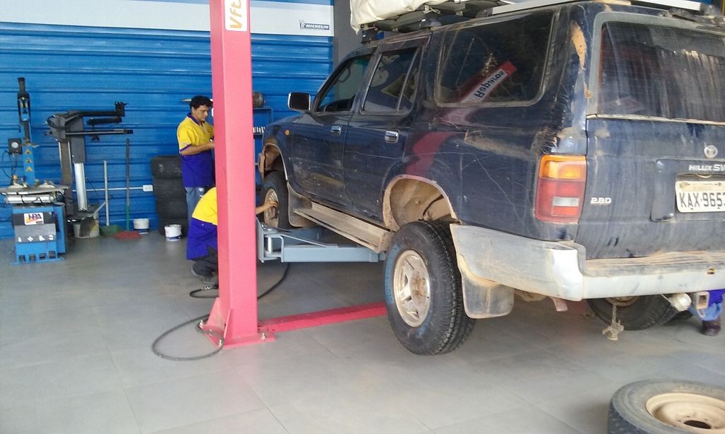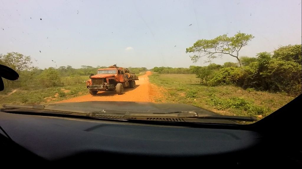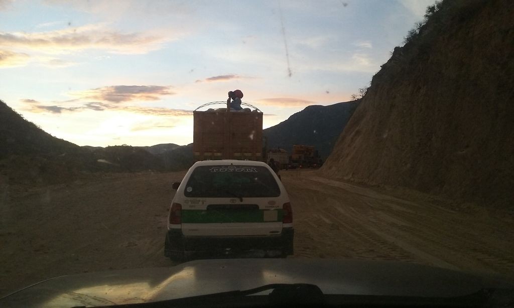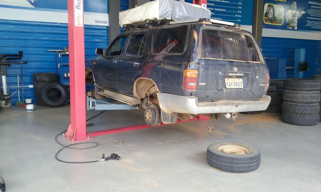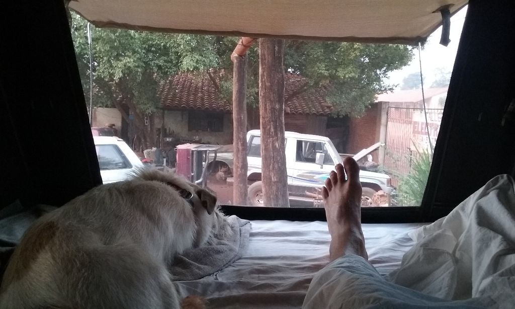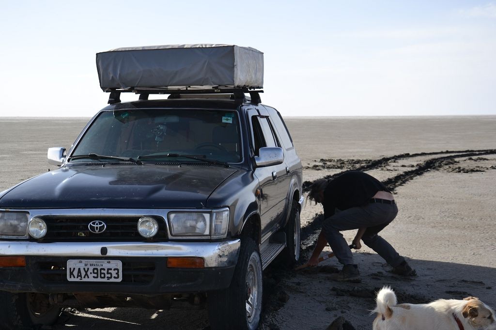 Die Schotter- und Erdpisten zerstören auf Dauer unser Auto. Wir haben das hintere Gummi verloren, das den Auspuff am Wagen hält. Die improvisierte Notlösung aus Schlauchschellen und Kabelbindern hält das Rohr zwar in Position, macht aber bei jedem Schlagloch und bei jeder Bodenwelle ein fieses metallisches Geräusch. Zudem funktioniert der Motor der Heckscheibe nur noch sporadisch, wir können die Heckklappe also nur noch öffnen, wenn der Gott der Fensterheber uns wohlgesonnen ist. Die Alternativlösung, das Be- und Entladen von innen, ist umständlich und kräftezehrend.