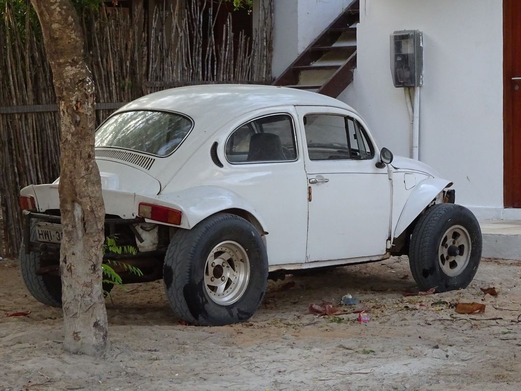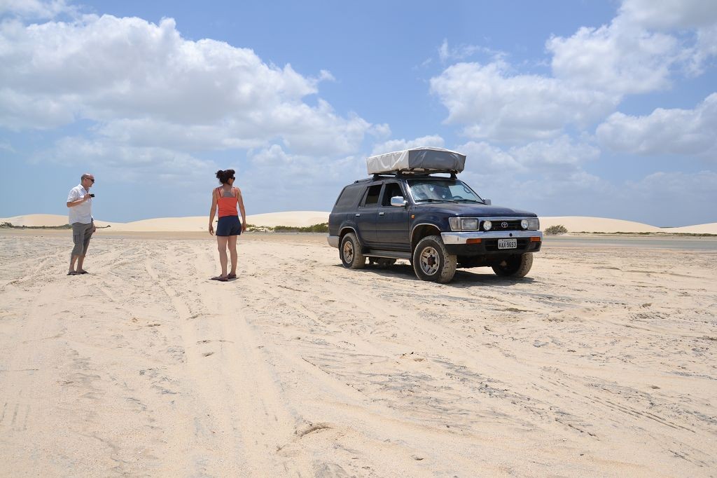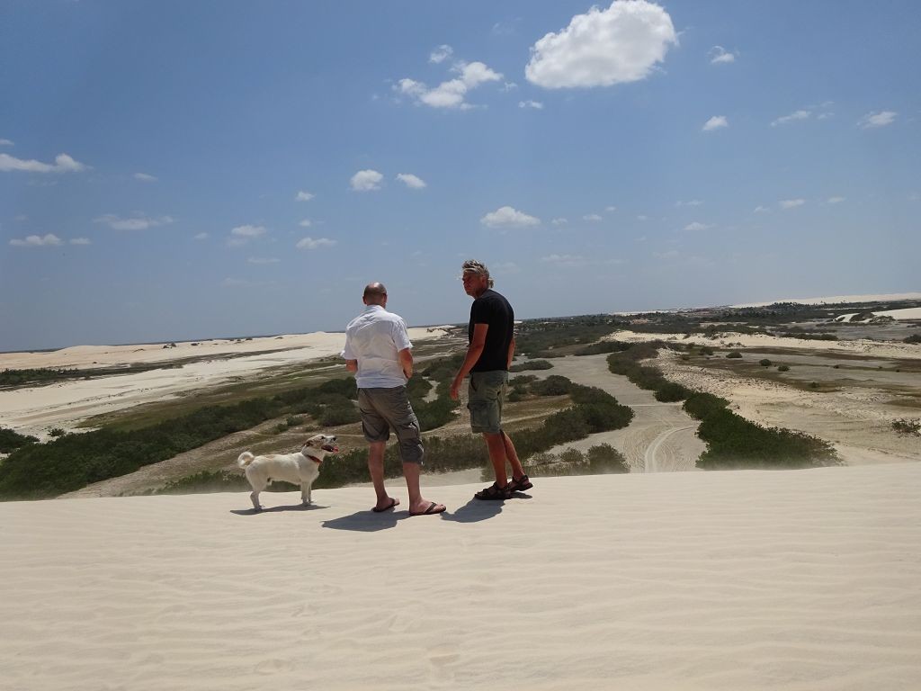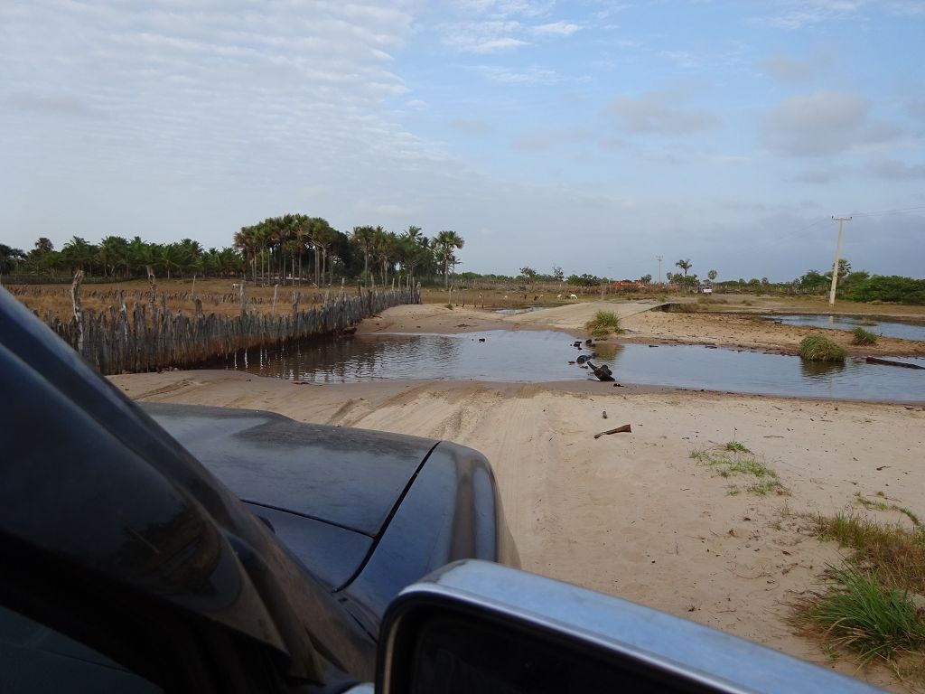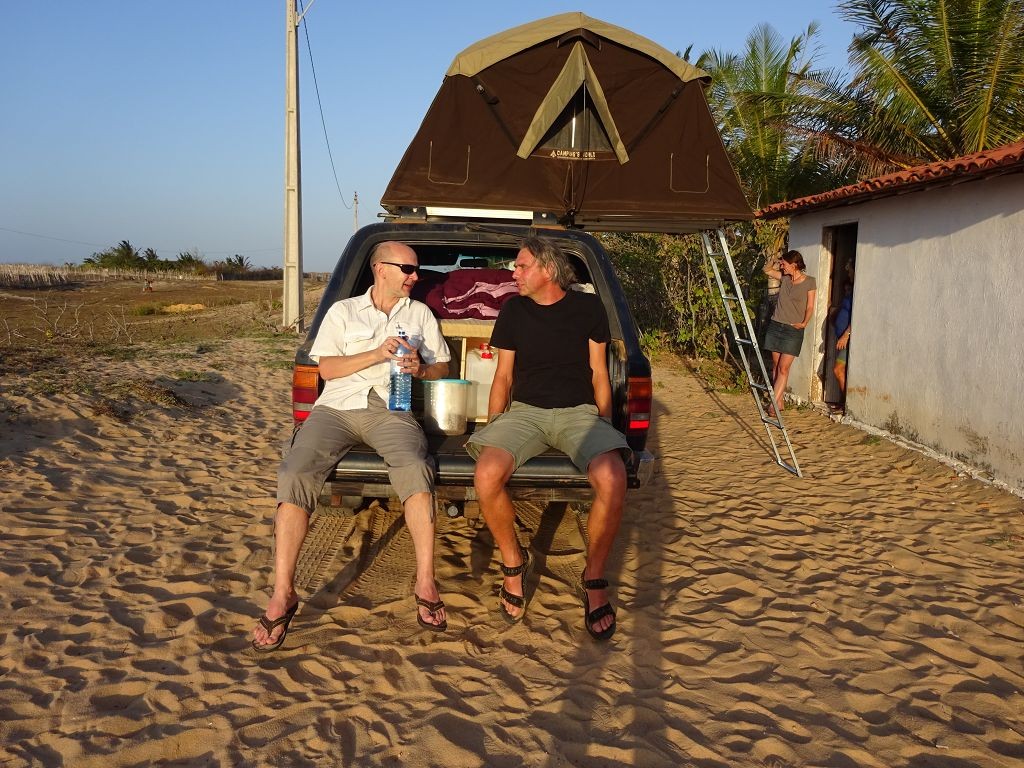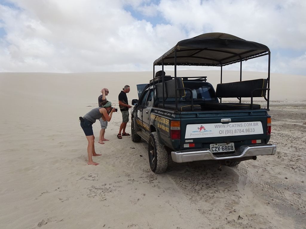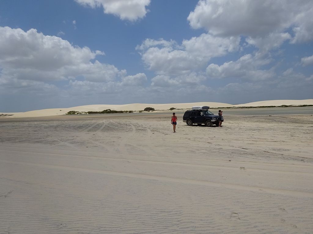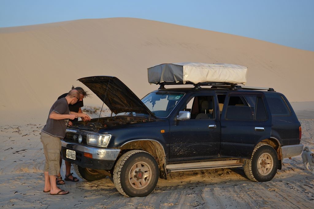 Während ich beim Trocknen gesandstrahlt wurde, huschten mehrere Strandbuggys mit Touristen im typischen Outfit vorbei. Okay, selbst hier gab es organisierten Tourismus. Ich zog mich wieder an und folgte den Spuren der Buggys, welche nach einigen Kilometern den Strand verließen und landeinwärts führten. An der ersten Strandbar auf einer kleinen Düne hielt ich an. Die Bar war vollkommen leer. Nur eine lächelnde ältere Frau stand hinter der Theke. Ich stieg aus und begrüßte sie mit einem Kommentar über die Schönheit des Ortes. Die Frau hieß Dalmira und war sehr freundlich. Während ich eine obligatorische Kokosnuss – die Getränkeauswahl bestand aus Bier, Wasser und Kokosnuss – ausschlürfte wollte sie mir den Ort erklären. Ich verstand aber nur die Hälfte. Als sie das erkannte, fragte sie mich, ob ihr Sohn mir den Ort zeigen sollte. Ich müsste sie nur zu ihm fahren. Ich willigte ein, und wir fuhren zusammen ungefähr einen Kilometer über eine Sandstraße in eine kleine Ansiedlung. Ihr Sohn hieß Chaga und war Fischer. Auch er war sehr freundlich und zog sich erst einmal feinere Klamotten an, bevor er auf dem Beifahrersitz platznahm. Während Dalmira zurück zu ihrer Strandbar lief, fuhren Chaga und ich durch die Dünen. Es gab ausschließlich Sandstraßen, die teilweise sehr versandet waren. Für mich war es das erste Mal, dass ich mit einem Allradfahrzeug über sehr lockeren Sand fuhr. Während unserer einjährigen Reise nach Zentralasien hatte ich mit unserem alten VW LT mit Hinterradantrieb immer gehörigen Respekt vor diesem Untergrund, da wir uns mehrfach festgefahren hatten. Jedes Mal bedurfte es viel Zeit und Schweiß, uns mit Schaufel, Wagenheber und Sandblechen zu befreien. Doch der Toyota ließ sich einfach nicht vom Sand beindrucken. Immer, wenn wir nicht mehr weiterkamen und die Reifen schon tief im Sand steckten, reichte es aus, die Geländeuntersetzung einzulegen und uns in kleinem Gang mit viel Drehzahl freizuwühlen. Ich war begeistert. Nicht so begeistert war ich davon, dass der Motor an einer Stelle in tiefem Sand vollkommen überhitzte und sogar ausging. Ich dachte schon, ich hätte ihn geschrottet und bekam ein sehr mulmiges Gefühl im Magen. Doch nachdem wir fünf Minuten gewartet hatten, sprang er wieder an, und ich fand heraus, dass das Antriebsaggregat bei viel Schlupf hohe Drehzahlen benötigt, um nicht zu überhitzen. Der Ventilator hinter dem Kühler hängt über eine Viskosekupplung an der Nockenwelle und dreht dadurch nur mit hohen Umdrehungen, wenn der Motor hoch dreht. Nachdem ich das verstanden hatte, legte ich auf losem Untergrund stets einen kleinen Gang ein und siehe da, die Motortemperatur blieb im grünen Bereich, auch bei Vollgas.