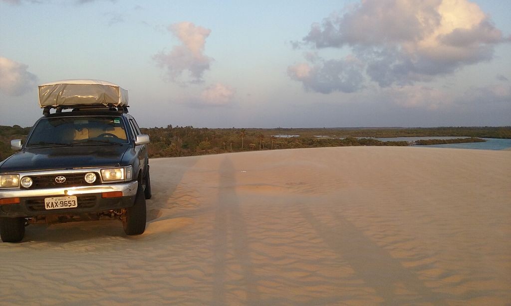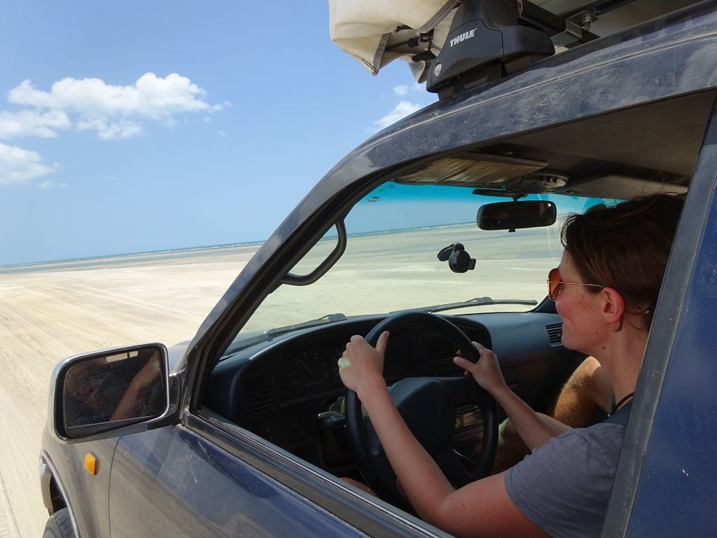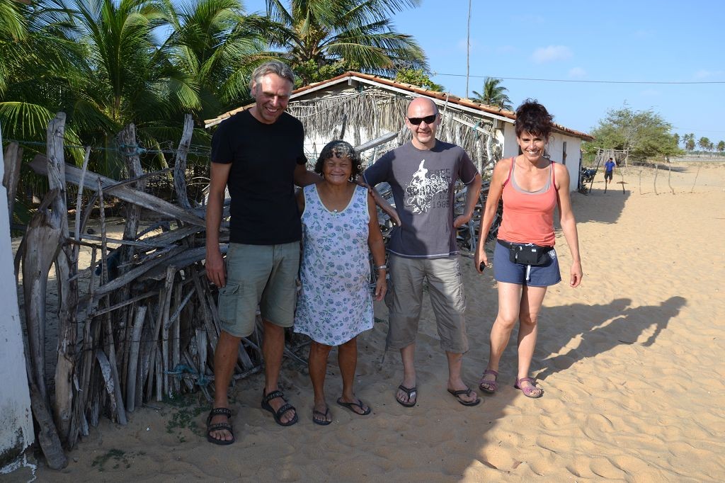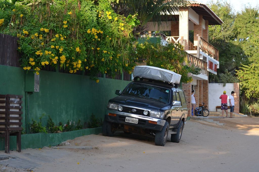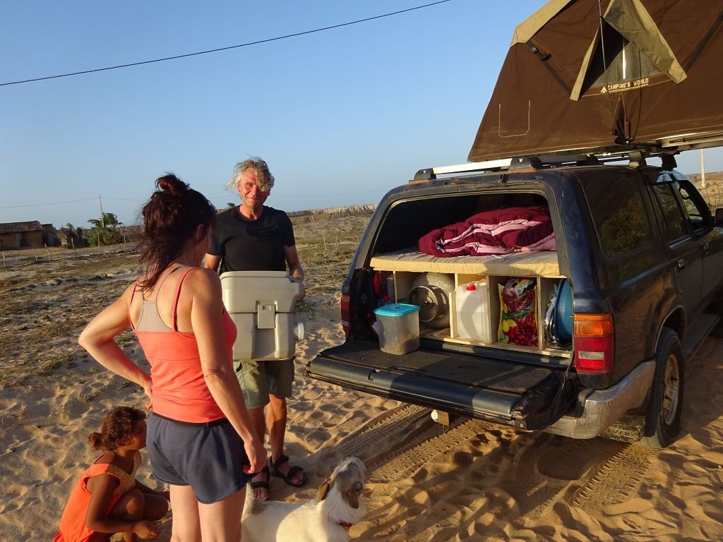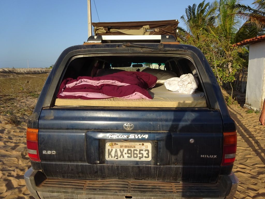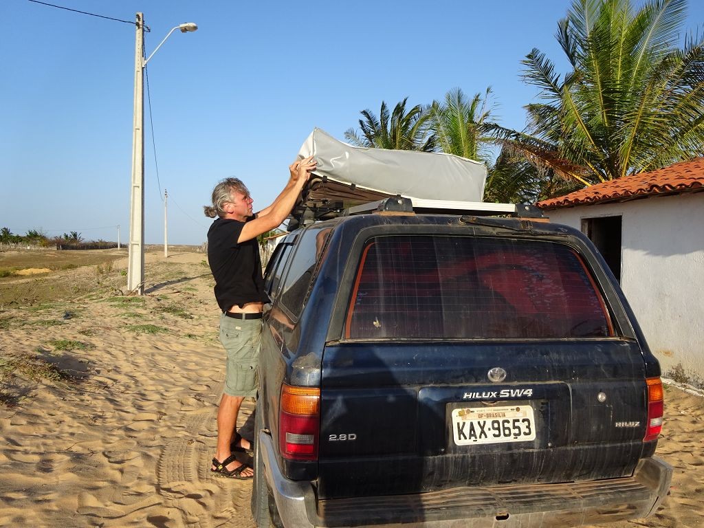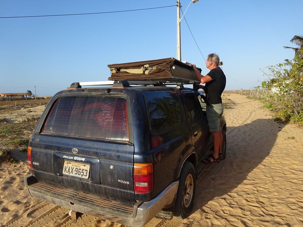 Während ich beim Trocknen gesandstrahlt wurde, huschten mehrere Strandbuggys mit Touristen im typischen Outfit vorbei. Okay, selbst hier gab es organisierten Tourismus. Ich zog mich wieder an und folgte den Spuren der Buggys, welche nach einigen Kilometern den Strand verließen und landeinwärts führten. An der ersten Strandbar auf einer kleinen Düne hielt ich an. Die Bar war vollkommen leer. Nur eine lächelnde ältere Frau stand hinter der Theke. Ich stieg aus und begrüßte sie mit einem Kommentar über die Schönheit des Ortes. Die Frau hieß Dalmira und war sehr freundlich. Während ich eine obligatorische Kokosnuss – die Getränkeauswahl bestand aus Bier, Wasser und Kokosnuss – ausschlürfte wollte sie mir den Ort erklären. Ich verstand aber nur die Hälfte. Als sie das erkannte, fragte sie mich, ob ihr Sohn mir den Ort zeigen sollte. Ich müsste sie nur zu ihm fahren. Ich willigte ein, und wir fuhren zusammen ungefähr einen Kilometer über eine Sandstraße in eine kleine Ansiedlung. Ihr Sohn hieß Chaga und war Fischer. Auch er war sehr freundlich und zog sich erst einmal feinere Klamotten an, bevor er auf dem Beifahrersitz platznahm. Während Dalmira zurück zu ihrer Strandbar lief, fuhren Chaga und ich durch die Dünen. Es gab ausschließlich Sandstraßen, die teilweise sehr versandet waren. Für mich war es das erste Mal, dass ich mit einem Allradfahrzeug über sehr lockeren Sand fuhr. Während unserer einjährigen Reise nach Zentralasien hatte ich mit unserem alten VW LT mit Hinterradantrieb immer gehörigen Respekt vor diesem Untergrund, da wir uns mehrfach festgefahren hatten. Jedes Mal bedurfte es viel Zeit und Schweiß, uns mit Schaufel, Wagenheber und Sandblechen zu befreien. Doch der Toyota ließ sich einfach nicht vom Sand beindrucken. Immer, wenn wir nicht mehr weiterkamen und die Reifen schon tief im Sand steckten, reichte es aus, die Geländeuntersetzung einzulegen und uns in kleinem Gang mit viel Drehzahl freizuwühlen. Ich war begeistert. Nicht so begeistert war ich davon, dass der Motor an einer Stelle in tiefem Sand vollkommen überhitzte und sogar ausging. Ich dachte schon, ich hätte ihn geschrottet und bekam ein sehr mulmiges Gefühl im Magen. Doch nachdem wir fünf Minuten gewartet hatten, sprang er wieder an, und ich fand heraus, dass das Antriebsaggregat bei viel Schlupf hohe Drehzahlen benötigt, um nicht zu überhitzen. Der Ventilator hinter dem Kühler hängt über eine Viskosekupplung an der Nockenwelle und dreht dadurch nur mit hohen Umdrehungen, wenn der Motor hoch dreht. Nachdem ich das verstanden hatte, legte ich auf losem Untergrund stets einen kleinen Gang ein und siehe da, die Motortemperatur blieb im grünen Bereich, auch bei Vollgas.