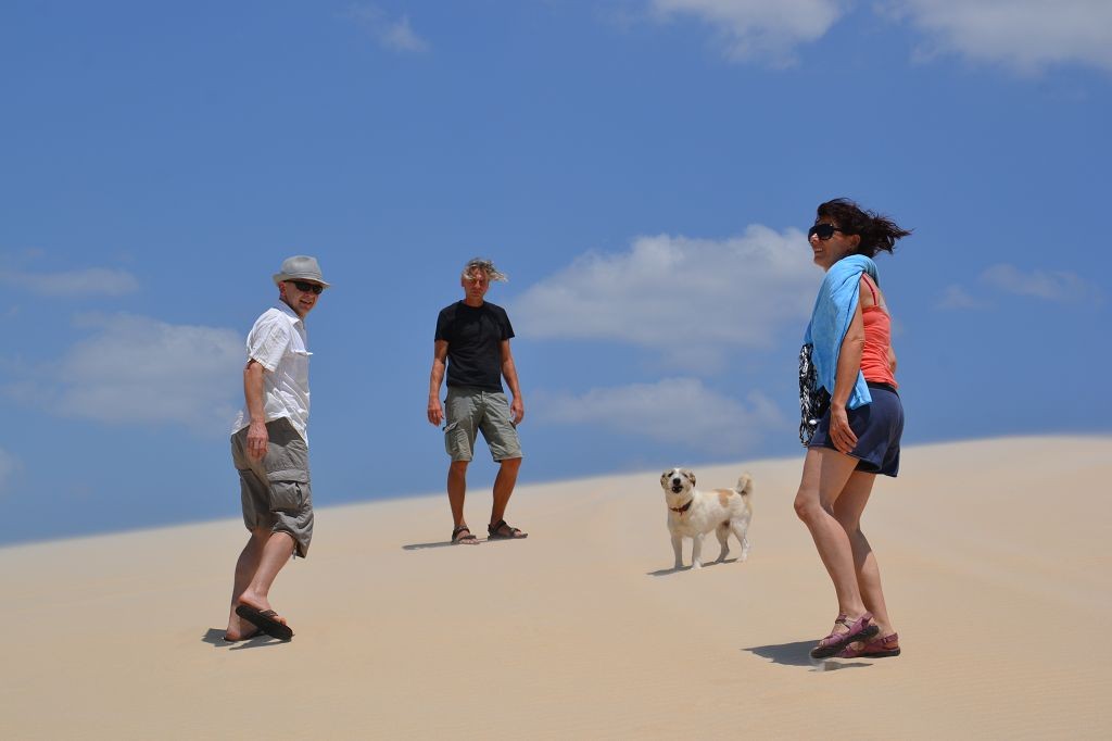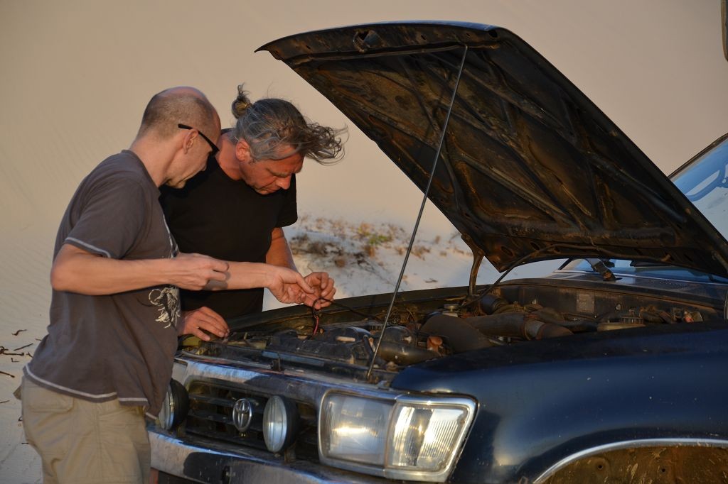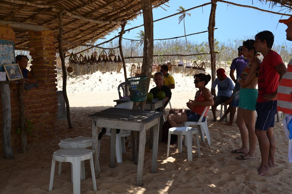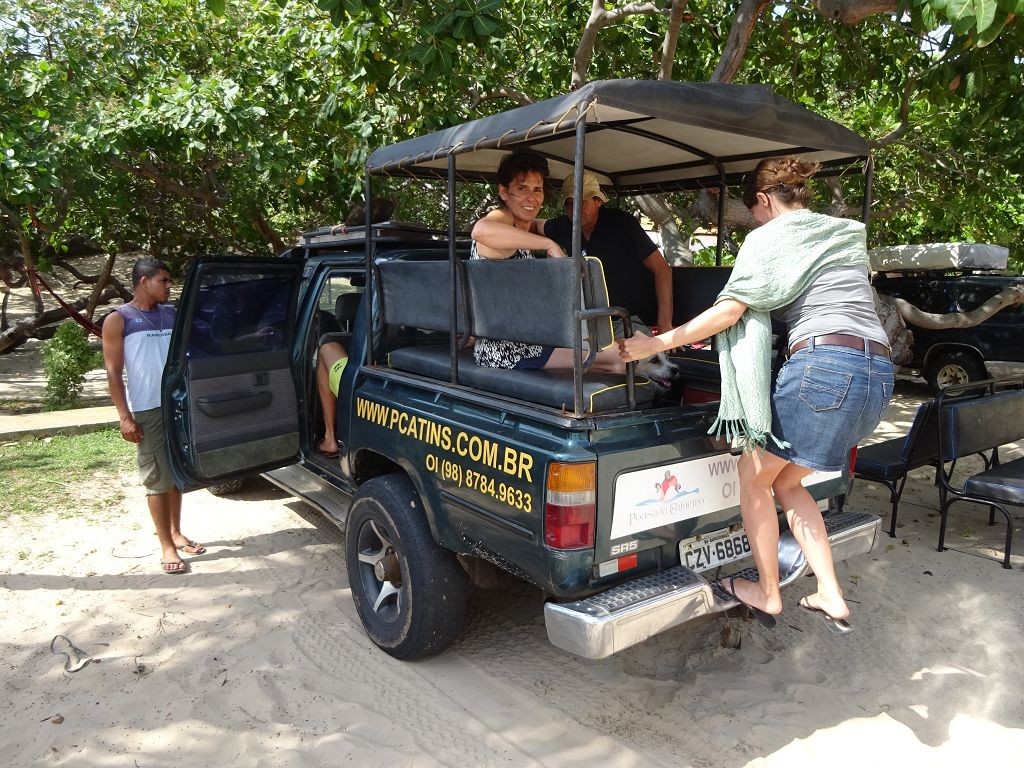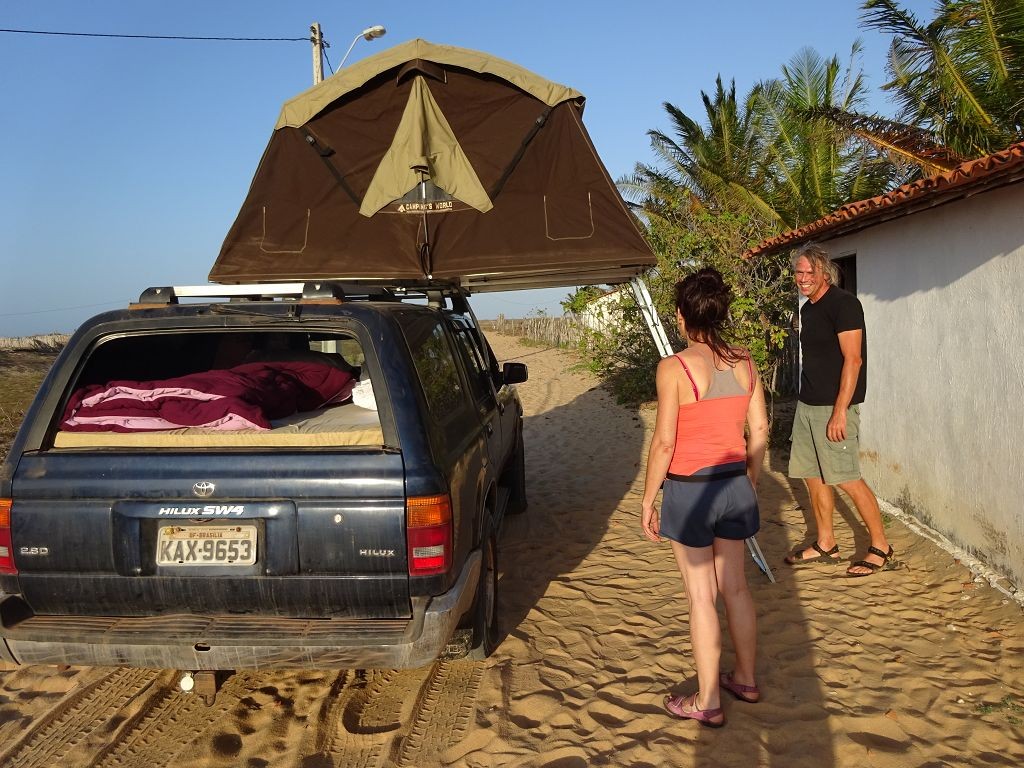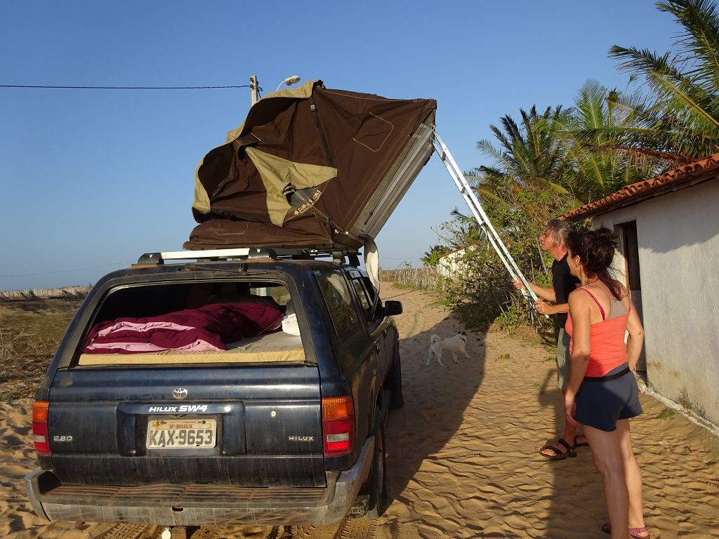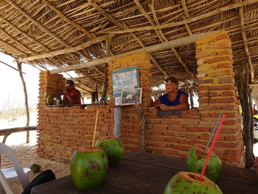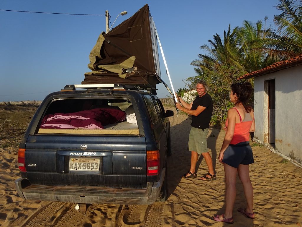 Während ich beim Trocknen gesandstrahlt wurde, huschten mehrere Strandbuggys mit Touristen im typischen Outfit vorbei. Okay, selbst hier gab es organisierten Tourismus. Ich zog mich wieder an und folgte den Spuren der Buggys, welche nach einigen Kilometern den Strand verließen und landeinwärts führten. An der ersten Strandbar auf einer kleinen Düne hielt ich an. Die Bar war vollkommen leer. Nur eine lächelnde ältere Frau stand hinter der Theke. Ich stieg aus und begrüßte sie mit einem Kommentar über die Schönheit des Ortes. Die Frau hieß Dalmira und war sehr freundlich. Während ich eine obligatorische Kokosnuss – die Getränkeauswahl bestand aus Bier, Wasser und Kokosnuss – ausschlürfte wollte sie mir den Ort erklären. Ich verstand aber nur die Hälfte. Als sie das erkannte, fragte sie mich, ob ihr Sohn mir den Ort zeigen sollte. Ich müsste sie nur zu ihm fahren. Ich willigte ein, und wir fuhren zusammen ungefähr einen Kilometer über eine Sandstraße in eine kleine Ansiedlung. Ihr Sohn hieß Chaga und war Fischer. Auch er war sehr freundlich und zog sich erst einmal feinere Klamotten an, bevor er auf dem Beifahrersitz platznahm. Während Dalmira zurück zu ihrer Strandbar lief, fuhren Chaga und ich durch die Dünen. Es gab ausschließlich Sandstraßen, die teilweise sehr versandet waren. Für mich war es das erste Mal, dass ich mit einem Allradfahrzeug über sehr lockeren Sand fuhr. Während unserer einjährigen Reise nach Zentralasien hatte ich mit unserem alten VW LT mit Hinterradantrieb immer gehörigen Respekt vor diesem Untergrund, da wir uns mehrfach festgefahren hatten. Jedes Mal bedurfte es viel Zeit und Schweiß, uns mit Schaufel, Wagenheber und Sandblechen zu befreien. Doch der Toyota ließ sich einfach nicht vom Sand beindrucken. Immer, wenn wir nicht mehr weiterkamen und die Reifen schon tief im Sand steckten, reichte es aus, die Geländeuntersetzung einzulegen und uns in kleinem Gang mit viel Drehzahl freizuwühlen. Ich war begeistert. Nicht so begeistert war ich davon, dass der Motor an einer Stelle in tiefem Sand vollkommen überhitzte und sogar ausging. Ich dachte schon, ich hätte ihn geschrottet und bekam ein sehr mulmiges Gefühl im Magen. Doch nachdem wir fünf Minuten gewartet hatten, sprang er wieder an, und ich fand heraus, dass das Antriebsaggregat bei viel Schlupf hohe Drehzahlen benötigt, um nicht zu überhitzen. Der Ventilator hinter dem Kühler hängt über eine Viskosekupplung an der Nockenwelle und dreht dadurch nur mit hohen Umdrehungen, wenn der Motor hoch dreht. Nachdem ich das verstanden hatte, legte ich auf losem Untergrund stets einen kleinen Gang ein und siehe da, die Motortemperatur blieb im grünen Bereich, auch bei Vollgas.