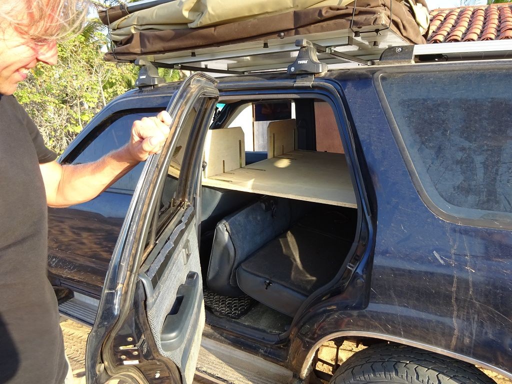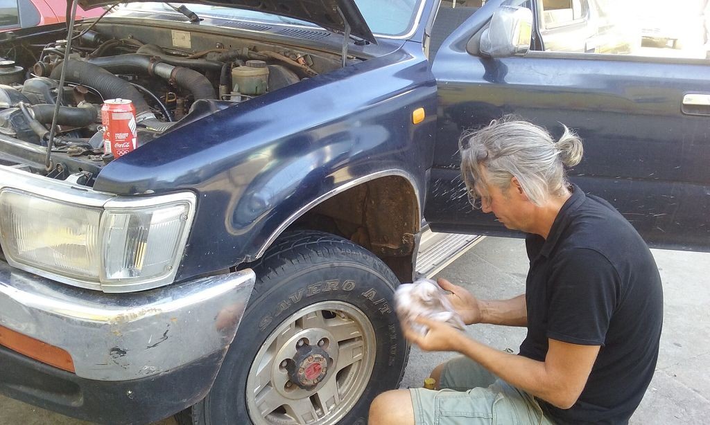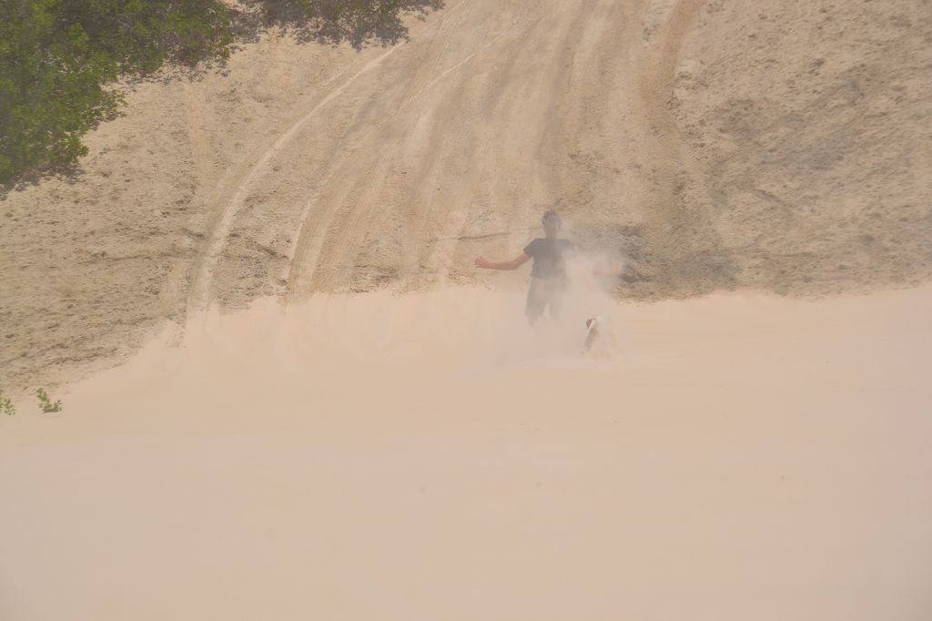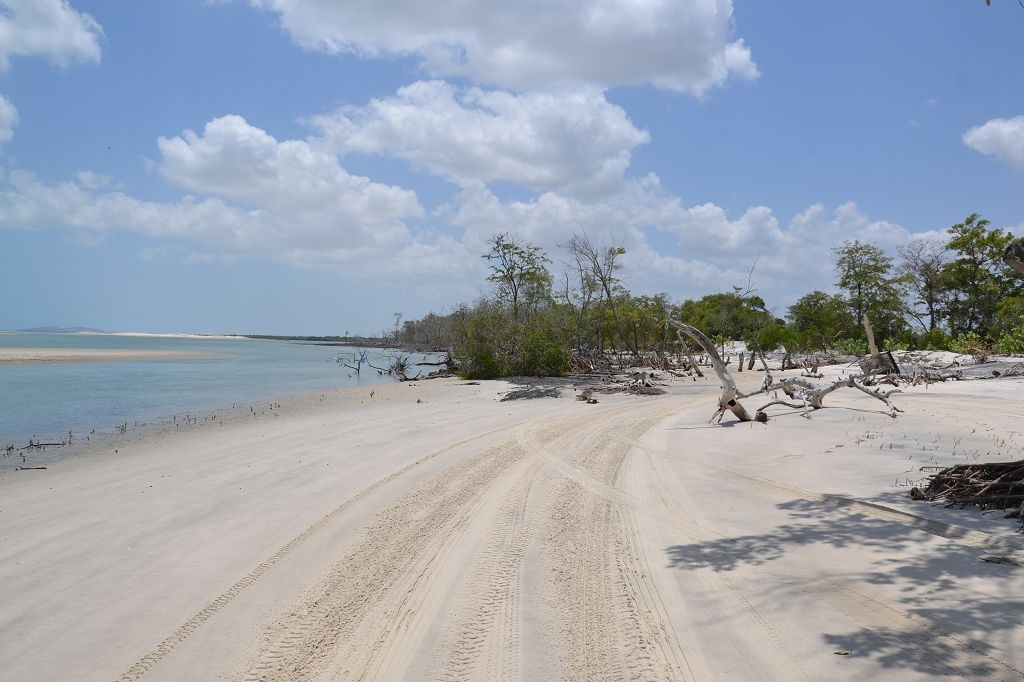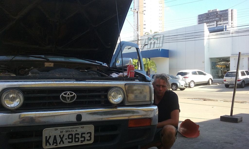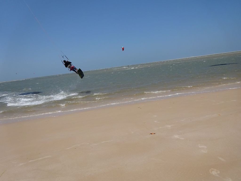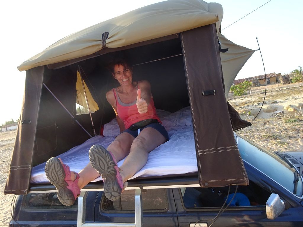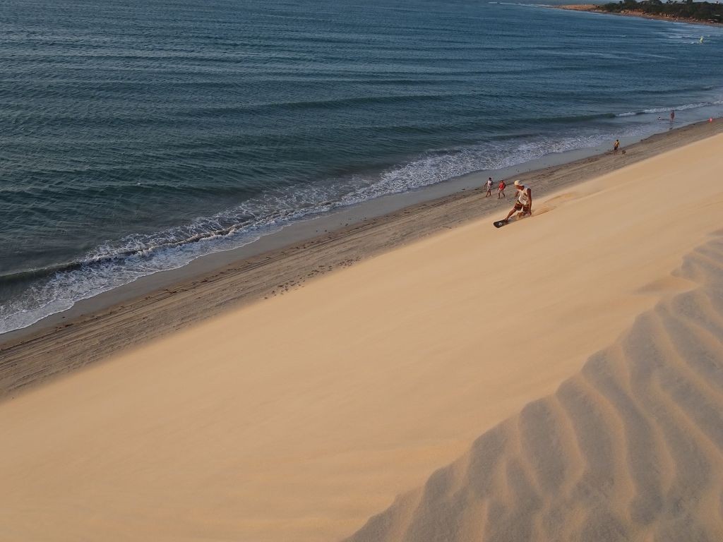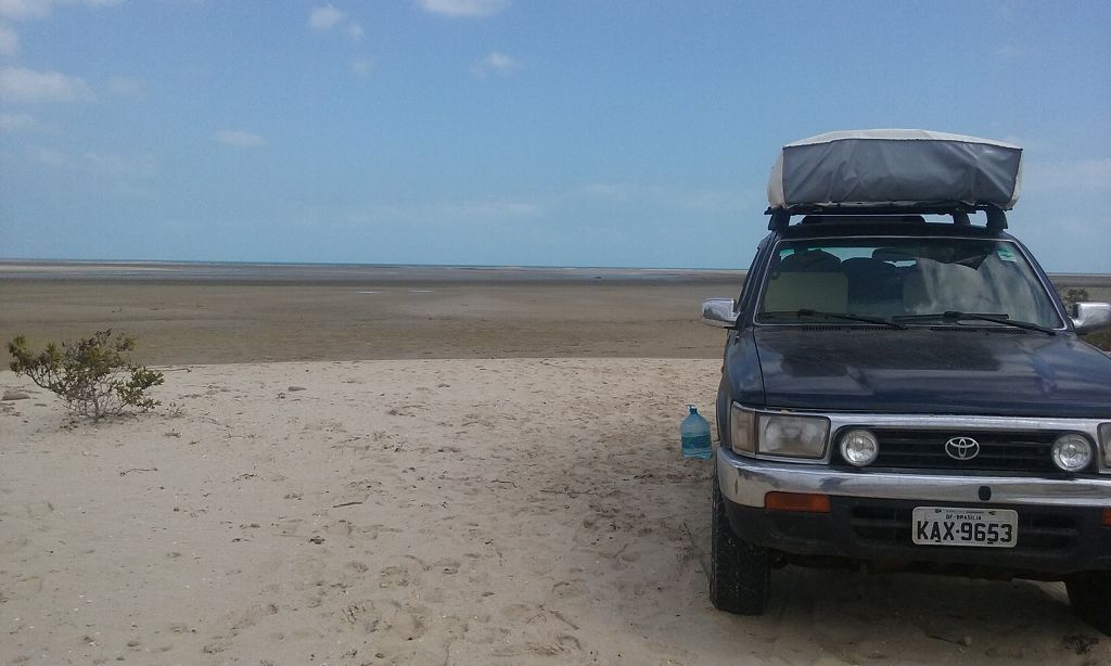 Während ich beim Trocknen gesandstrahlt wurde, huschten mehrere Strandbuggys mit Touristen im typischen Outfit vorbei. Okay, selbst hier gab es organisierten Tourismus. Ich zog mich wieder an und folgte den Spuren der Buggys, welche nach einigen Kilometern den Strand verließen und landeinwärts führten. An der ersten Strandbar auf einer kleinen Düne hielt ich an. Die Bar war vollkommen leer. Nur eine lächelnde ältere Frau stand hinter der Theke. Ich stieg aus und begrüßte sie mit einem Kommentar über die Schönheit des Ortes. Die Frau hieß Dalmira und war sehr freundlich. Während ich eine obligatorische Kokosnuss – die Getränkeauswahl bestand aus Bier, Wasser und Kokosnuss – ausschlürfte wollte sie mir den Ort erklären. Ich verstand aber nur die Hälfte. Als sie das erkannte, fragte sie mich, ob ihr Sohn mir den Ort zeigen sollte. Ich müsste sie nur zu ihm fahren. Ich willigte ein, und wir fuhren zusammen ungefähr einen Kilometer über eine Sandstraße in eine kleine Ansiedlung. Ihr Sohn hieß Chaga und war Fischer. Auch er war sehr freundlich und zog sich erst einmal feinere Klamotten an, bevor er auf dem Beifahrersitz platznahm. Während Dalmira zurück zu ihrer Strandbar lief, fuhren Chaga und ich durch die Dünen. Es gab ausschließlich Sandstraßen, die teilweise sehr versandet waren. Für mich war es das erste Mal, dass ich mit einem Allradfahrzeug über sehr lockeren Sand fuhr. Während unserer einjährigen Reise nach Zentralasien hatte ich mit unserem alten VW LT mit Hinterradantrieb immer gehörigen Respekt vor diesem Untergrund, da wir uns mehrfach festgefahren hatten. Jedes Mal bedurfte es viel Zeit und Schweiß, uns mit Schaufel, Wagenheber und Sandblechen zu befreien. Doch der Toyota ließ sich einfach nicht vom Sand beindrucken. Immer, wenn wir nicht mehr weiterkamen und die Reifen schon tief im Sand steckten, reichte es aus, die Geländeuntersetzung einzulegen und uns in kleinem Gang mit viel Drehzahl freizuwühlen. Ich war begeistert. Nicht so begeistert war ich davon, dass der Motor an einer Stelle in tiefem Sand vollkommen überhitzte und sogar ausging. Ich dachte schon, ich hätte ihn geschrottet und bekam ein sehr mulmiges Gefühl im Magen. Doch nachdem wir fünf Minuten gewartet hatten, sprang er wieder an, und ich fand heraus, dass das Antriebsaggregat bei viel Schlupf hohe Drehzahlen benötigt, um nicht zu überhitzen. Der Ventilator hinter dem Kühler hängt über eine Viskosekupplung an der Nockenwelle und dreht dadurch nur mit hohen Umdrehungen, wenn der Motor hoch dreht. Nachdem ich das verstanden hatte, legte ich auf losem Untergrund stets einen kleinen Gang ein und siehe da, die Motortemperatur blieb im grünen Bereich, auch bei Vollgas.