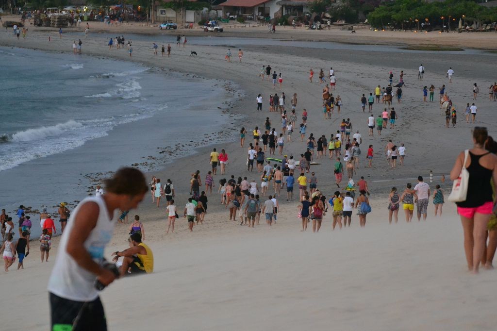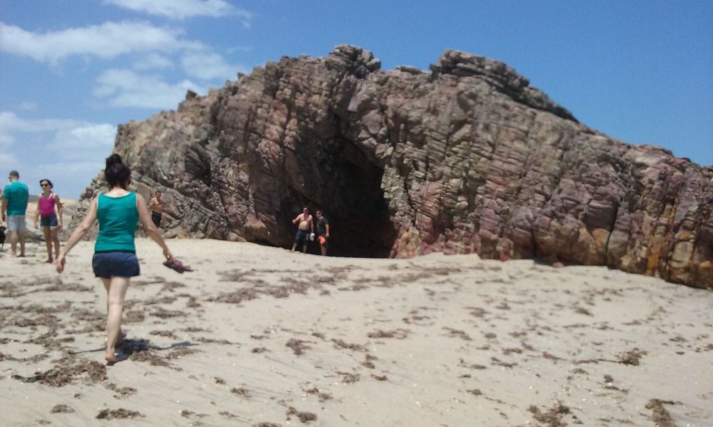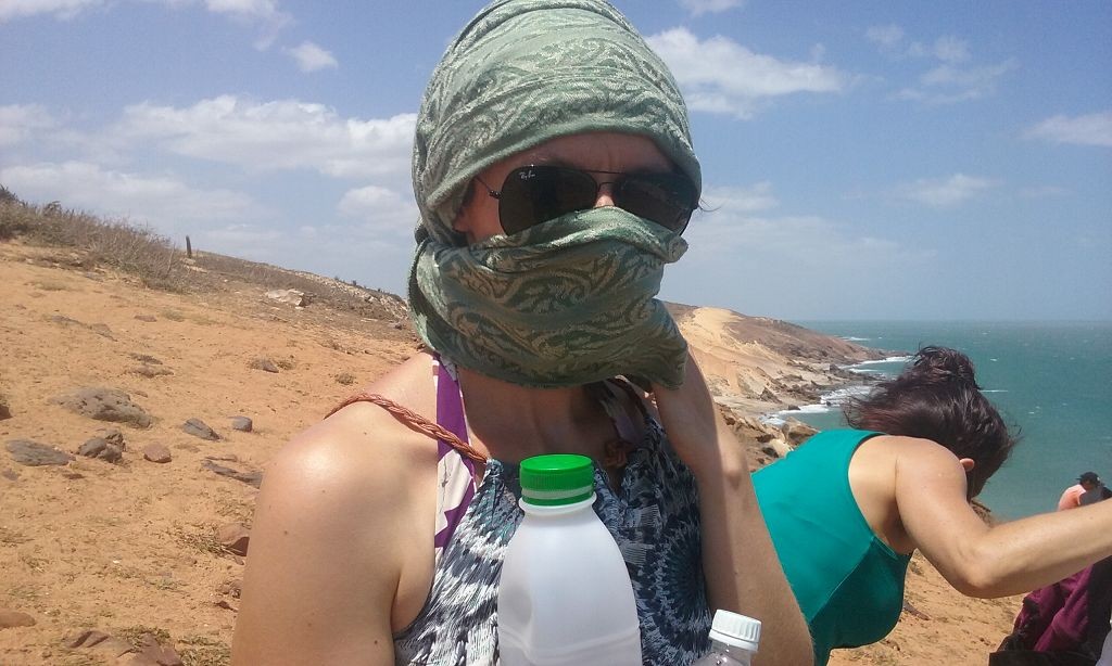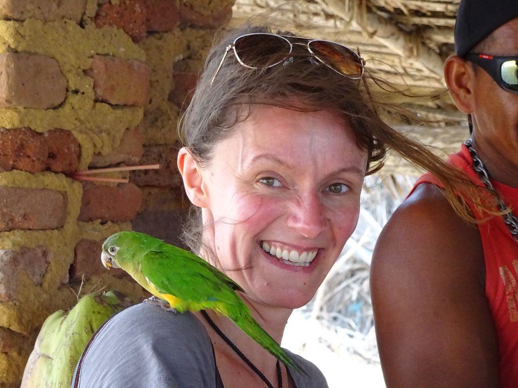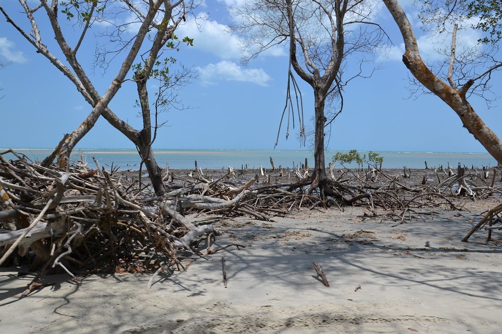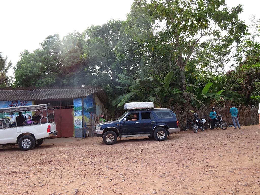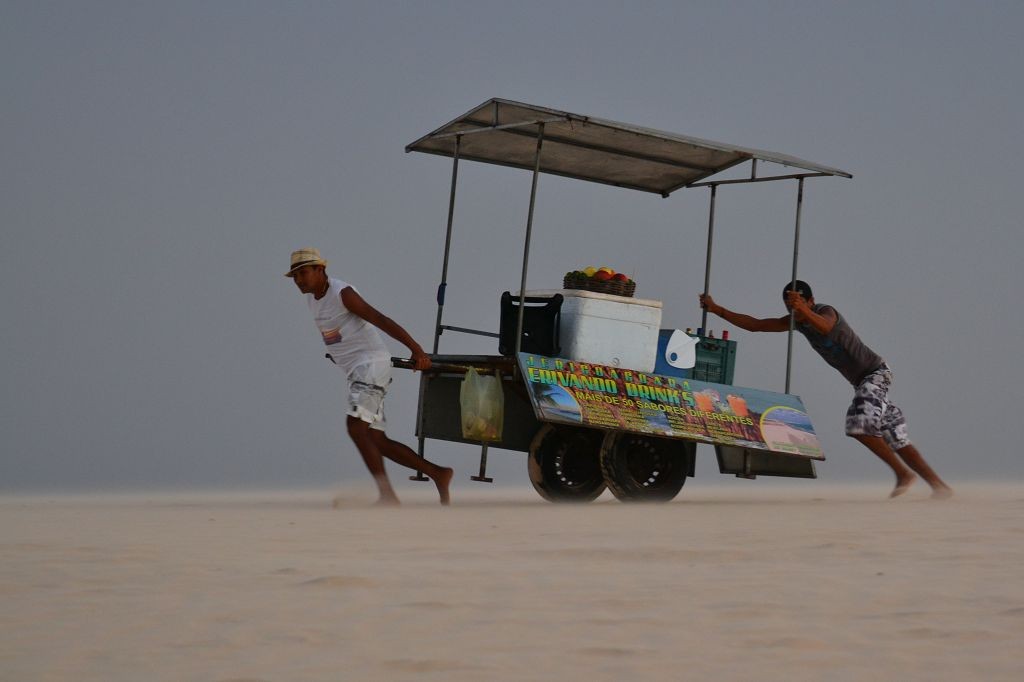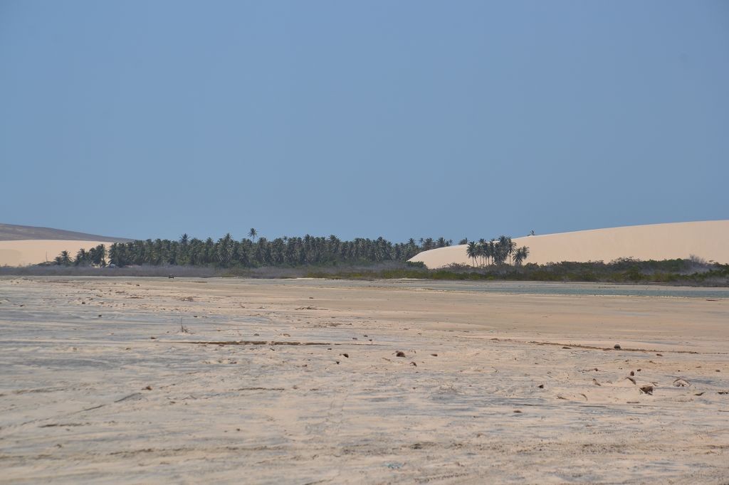 Die Nacht verlief sehr ruhig. Am nächsten Morgen wanderte ich durch den Ort und durch die Dünen. Ich wollte die Infrastruktur genauer verstehen. Am Vortag waren wir während der Führung über so viele Wege gefahren, dass ich ständig die Orientierung verloren hatte. Tatsächlich stellte sich heraus, dass die Sandwege variabel von Ebbe und Flut abhängig waren. Eine ganze Reihe an Wegen war nur bei Ebbe befahrbar. Nach der Wanderung kam ich auf dem Rückweg an Dalmiras Bar vorbei und ich fragte sie, ob ich mich mit meinem Wagen neben die Bar stellen durfte. Sie willigte ein, und ich stellte mich unter einem Baum neben die Bar in den Schatten. An diesem Tag war Dalmira nicht allein. Ein älterer Mann – offenbar ich Ehegatte – sowie mehrere junge Männer – offenbar weitere Söhne – und Kinder – offenbar ihre Enkel – waren bei ihr. Auch die gegenüberliegende Strandbar, die am Vortag verlassen war, war mit Personal besetzt, jedoch weit und breit außer mir keine Kunden. Ich setzte mich an einen Tisch und bestellte eine Kokosnuss und ein Wasser für den Hund. Dann saßen wir alle da und schwiegen. Seltsame Stimmung, dachte ich mir. Es lag etwas von Spannung in der Luft, als ob in Kürze etwas passieren würde. Und tatsächlich, erst kam ein Buggy mit zwei typischen weißhäutigen Touristen mit der obligatorischen Kamera vor dem Bauch. Sie tranken etwas, und man bot ihnen Girlanden aus Fischschuppen und Holz an. Dalmira erzählte hinter der Theke mit einem Wellensittich auf der Schulter eine Geschichte über den Ort und die Kirche, die von einer großen Wanderdüne zerstört worden war. Dann fuhren vier Toyota Pickups mit jeweils 8 Touristen an Bord vor. Auf einmal war ein Riesenbohei. Es wurde Bier getrunken, Fotos gemacht, Souvenirs gekauft und auf Eseln geritten. Dalmira spulte immer wieder ihre Geschichte ab. Ich verzog mich in eine Ecke und verstand plötzlich ihr Geschäft. Wahrscheinlich bekamen die Fahrer der Wagen von ihr Geld, damit sie die Touristen bei ihr abluden.