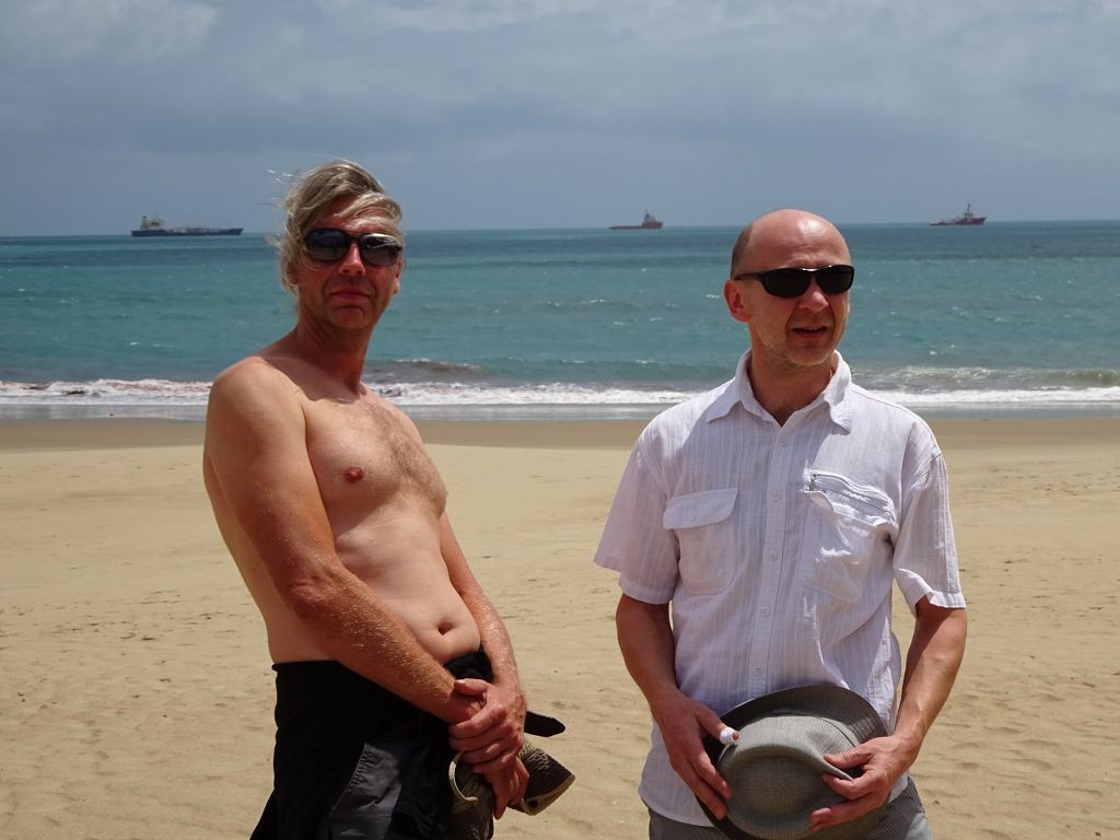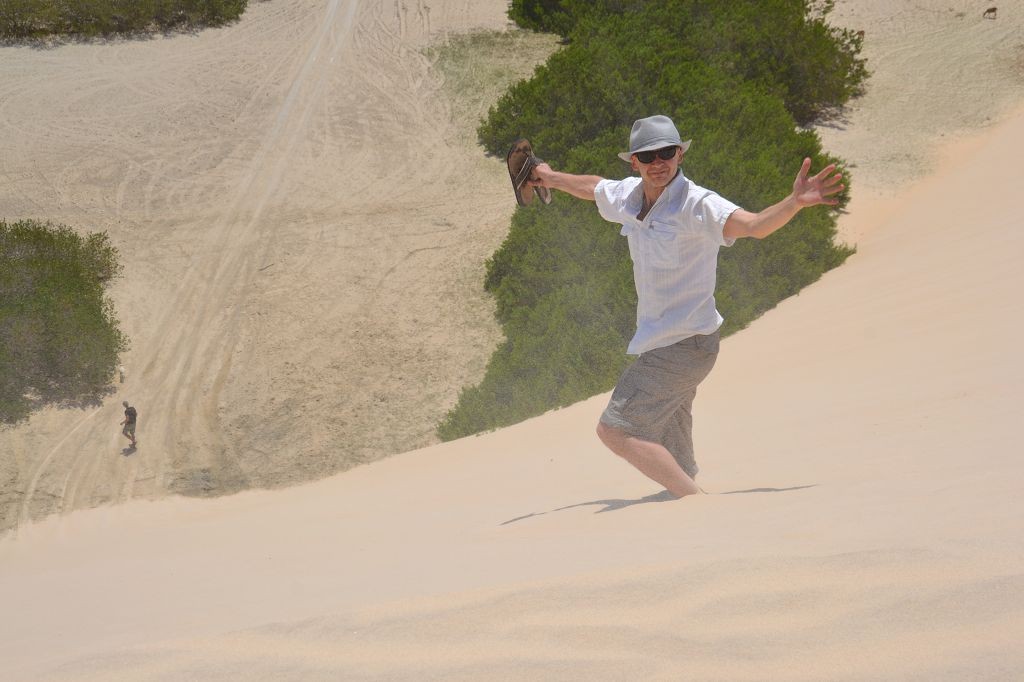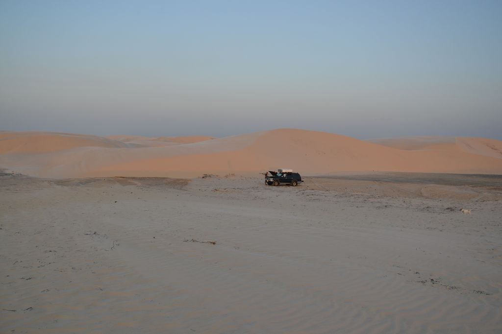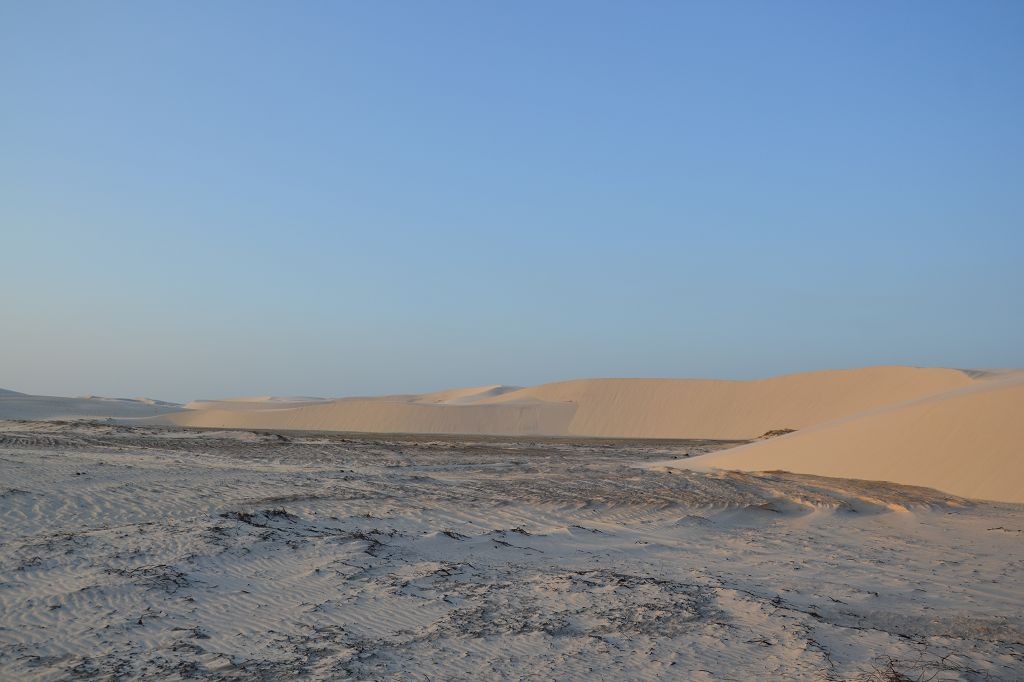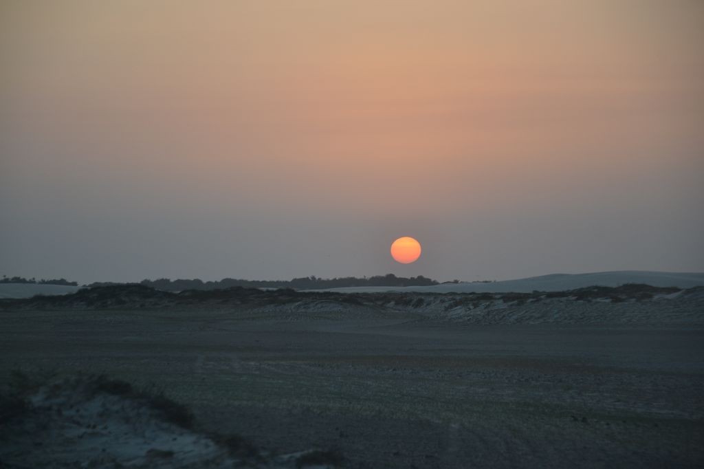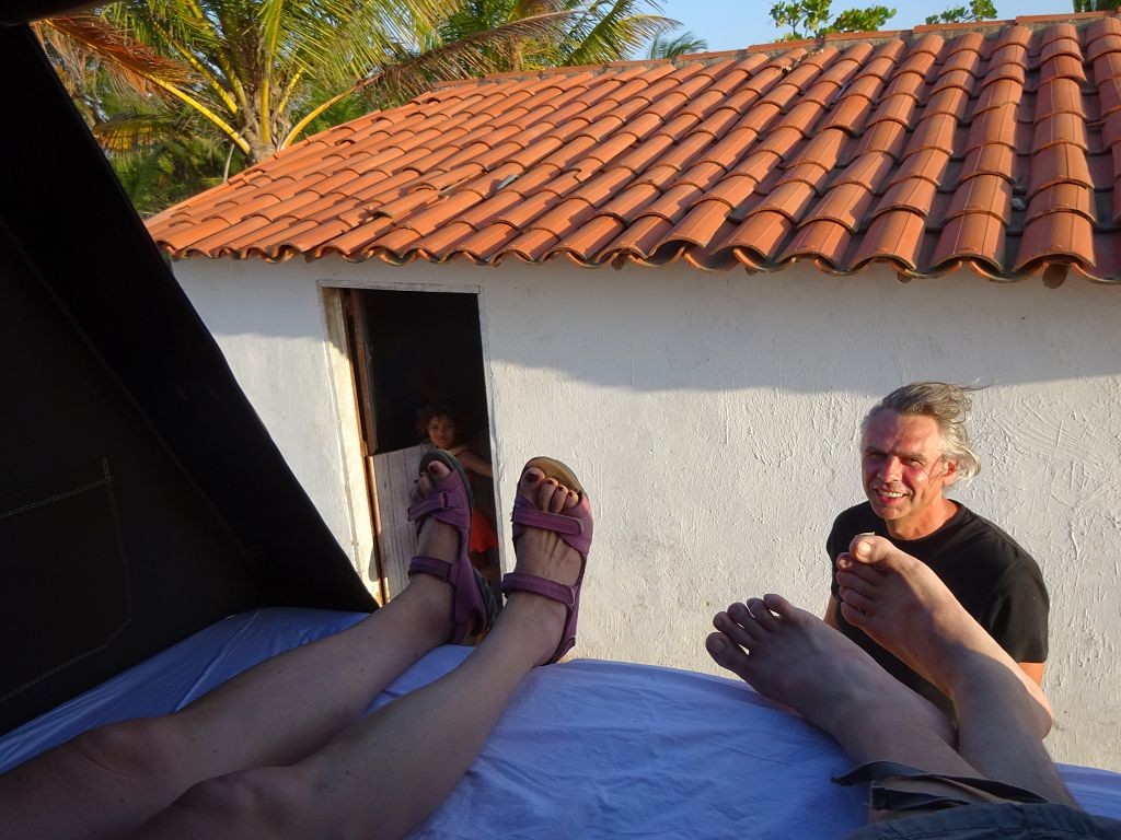 Das Haus hatte noch drei weitere Zimmer, in denen sich noch eine unübersichtliche Anzahl von Menschen – Erwachsene und Kinder – befanden. Später fand ich über Francisco, einem weiteren Sohn Dalmiras, heraus, dass sie neun Kinder zur Welt gebracht hatte. Drei davon seien schon als Baby verstorben, so dass sie sechs Geschwister seien. Ein nicht geringer Anteil davon lebte mit wiederum eigenen Kindern in dem Haus. Chaga fragte mich, ob ich mich waschen wollte, und als ich die Frage bejahte, zeigte er mir das Badezimmer. Es bestand aus einem Klo mit einer Sickergrube darunter und zwei Bottichen Wasser. Ich überlegte, mich zu überwinden, doch dann fragte ich, ob ich einfach nur Wasser haben könnte. Schließlich hatte ich eine Solardusche. Chaga führte mich zu dem Brunnen hinter dem Haus, wo die Palmen standen, deren Kokosnüsse sie in der Bar verkauften. Über eine elektrische Pumpe und einen Schlauch pumpten wir Wasser in den Beutel meiner Solardusche. Dann wurde ich noch in das Haus der Großmutter geführt, die im Nebenhaus in einem Zimmer mit einem Bett und einem Fernseher lebte. Das Haus daneben, das zwei Zimmer hatte, wurde mir angeboten. Darin befand sich nichts. Es handelte sich quasi um einen Rohbau. Doch ich holte aus dem Auto das Klo, den Kocher und die Gasflasche sowie Stühle und den kleinen Tisch. Dann machte ich mir die erste warme Mahlzeit auf der Reise. Am Abend ging ich wieder spazieren und genoss den Ausblick auf der großen Wanderdüne.
